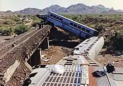 The 1995 Palo Verde derailment took place on October 9, 1995, when Amtrak's Sunset Limited was derailed by saboteurs near Palo Verde, Arizona on Southern Pacific Railroad tracks. Two locomotives, Amtrak GE P32-8BWH #511 leading and EMD F40PHR #398 trailing, and eight of twelve cars derailed, four of them falling 30 feet (9 m) off a trestle bridge into a dry river bed.[1] Mitchell Bates, a sleeping car attendant, was killed. Seventy-eight people were injured, 12 of them seriously and 25 were hospitalized.[2]