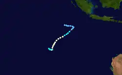 On 3 December, an area of concentrated convection developed from a monsoon trough over the Indian Ocean. The next day RSMC La Reunion issued one advisory on this system, labeling it "A3". Over the next few days the area drifted eastward into the Australian region and slowly organized. The warning center at Perth initiated bulletins on the tropical low on 7 December when the system was located 175 nm west-northwest of Cocos Island. The low remained essentially stationary for the next 48 hours while slowly weakening. Perth discontinued bulletins on the 8th, but continued to track the low for the next few days. The remnants of the low drifted eastward to a point about 150 nm north-northwest of Cocos. There is a significant possibility that this low is the same persistent one that developed into Tropical Cyclone Cathy.[2]