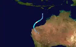 On 3 December a tropical depression formed in the Arafura Sea, 250 miles east-northeast of Darwin. The system drifted southwestward, strengthening into Tropical Cyclone Thelma on 6 December. Thelma continued to intensify as it turned to the south-southwest, reaching Category 5 strengthen on the Australian cyclone scale as it brushed the Tiwi Islands.[4] Cyclone Thelma reached a peak of 140 mph with a minimum pressure of 925 mbar on the 8th, and made landfall on the western Australian coastline on the 10th. After making landfall, the storm paralleled the coastline, and rapidly weakened to a tropical storm. Favorable conditions aloft allowed it to remain a tropical storm until the 15th, when the storm dissipated near Port Hedland. Thelma was responsible for moderate rainfall and downed trees, but caused no casualties due to the sparse population of where it hit.