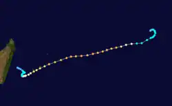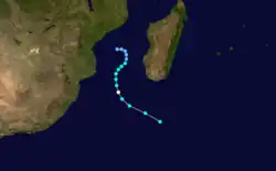 In November, rapidly weakening Tropical Cyclone Alison moved from the Australian basin and dissipated immediately upon entering the south-west Indian Ocean on November 13.[19] On December 4, short-lived Tropical Disturbance A3 was classified by MFR, subsequently drifting into the Australian region.[20] Possibly related to the previous system, Tropical Cyclone Cathy moved from the Australian basin into the basin on December 28, quickly dissipating.[20][21]