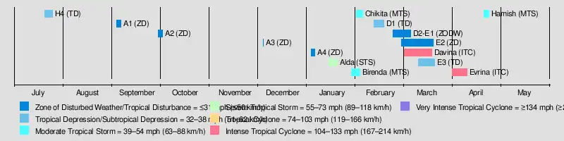 Activity began late, with the first tropical storm – Alda – forming on January 16, the third latest ever recorded at the time. Alda formed in the Mozambique Channel, which was one of few favorable areas for tropical cyclogenesis in the season. It brought rainfall to southwestern Madagascar that alleviated previously dry conditions. The next five tropical storms either originated or crossed into the adjacent Australian basin, where storms were monitored by the Bureau of Meteorology (BoM). Both Tropical Storm Chikita and Tropical Cyclone Davina brought beneficial rainfall to the Mascarene Islands. The latter storm caused two drowning deaths on Réunion and caused some crop damage. The strongest storm – Evrina – peaked as a strong cyclone in the Australian but weakened upon crossing 90°E, with 10-minute maximum sustained winds of 175 km/h (110 mph) in the basin. The final storm was unnamed, crossing from the Australian basin on April 21 as a minimal tropical storm before quickly dissipating. There were also several tropical disturbances or depressions, many short-lived. The first of these formed on September 3 in the northeastern portion of the basin, and there was a tropical depression in February in the Mozambique Channel that approached tropical storm status.