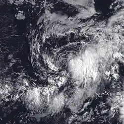 On July 19, a tropical wave moved off the coast of Africa. A mid-level circulation developed to the south of Cape Verde on July 22, though the wave became less distinct as it continued westward. The wave axis crossed Central America into the eastern Pacific Ocean on July 31. Convection steadily increased, though it was not until August 4 that the convection began to organize. Dvorak classifications began on August 4, and subsequent to the formation of a low-level circulation the system developed into Tropical Depression Seven-E on August 6 about 550 miles (890 km) south of the southern tip of the Baja California Peninsula. The depression tracked generally northward, under the influence of a ridge over Mexico and a mid-level trough to its west.[23] The center of the depression was initially elongated, with northerly wind shear impacting the structure of the cyclone.[24] This at first prevented further strengthening,[23] though convection increased and organized into banding features as it moved through an area of warm water.[25] On August 8, the depression intensified into Tropical Storm Frank, and it soon turned to the north-northwest, brushing the western coastline of Baja California. On August 9, Frank reached peak winds of 45 mph (72 km/h) about 105 miles (169 km) west-northwest of Ciudad Constitución. It turned to the northwest, with a portion of the circulation of the land, and steadily weakened after moving over cooler water. On August 10, Frank dissipated a short distance off Baja California.[23]