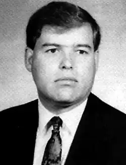 Detective John Michael Gibson (March 29, 1956 – July 24, 1998) was a United States Capitol Police officer assigned to the dignitary protection detail of Congressman Tom DeLay. He is buried in Arlington National Cemetery[27] after lying in honor with Chestnut in the Capitol rotunda. Gibson had served with the agency for 18 years. He was a native of Massachusetts who married the niece of Representative Joe Moakley.[28] He had three children, a 17-year-old daughter and two boys, ages 15 and 14. Growing up in New England, Gibson was a lifelong Boston Red Sox fan, and on August 11, 1998, the team held a moment of silence in his honor before a game with the Kansas City Royals.