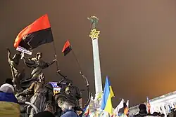 Flags of Ukraine and the Ukrainian nationalist movement flown on 29 November in Maidan Nezalezhnosti (Independence Square) before the attack