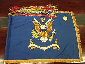 The regimental colors and battle streamers of 1-227 AV. The blue and red streamers of the Presidential Unit Citations and Meritorious Unit Commendations are prominent