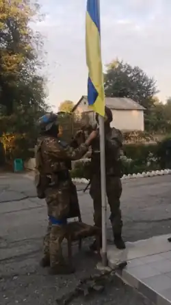 On 11 September 2022, the official page of the International Legion published footage of the 1st Battalion raising the Ukrainian flag in Kupiansk during the Kharkiv counteroffensive - demonstrating the success of the unit in combat actions.[3] Ensuing the liberation of Petropavlivka, the battalion and the Legion pushed east. When the frontline was established east of the Oskil River, the legionnaires switched to defending the new positions.[18]