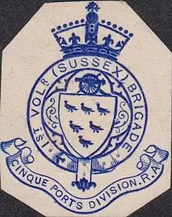 The 1st Sussex was assigned to the Cinque Ports Division of the Royal Artillery (RA) in 1882, transferring to the Eastern Division after the Cinque Ports Division was disbanded in 1889.[3][4][5][6]