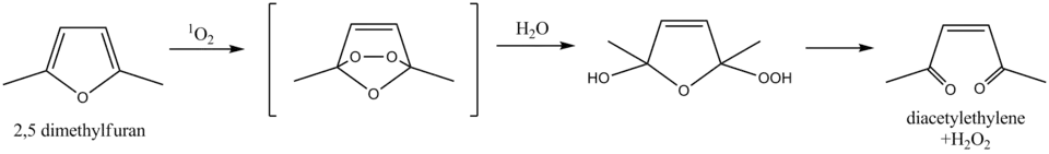 2,5-Dimethylfuran serves as a scavenger for singlet oxygen, a property which has been exploited for the determination of singlet oxygen in natural waters. The mechanism involves a Diels-Alder reaction followed by hydrolysis, ultimately leading to diacetylethylene and hydrogen peroxide as products. More recently, furfuryl alcohol has been used for the same purpose.[9]