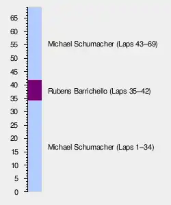 At the conclusion of lap 47, with the scheduled pit stops completed, the first six drivers were Michael Schumacher, Barrichello, Fisichella, Häkkinen, Trulli, and Wurz.[54] Michael Schumacher went off the wet track at turn one on lap 48, remaining half a minute ahead of Barrichello.[51][56] De La Rosa and Diniz were vying for 12th when contact between both drivers saw De La Rosa strike the barrier on the 49th lap. A broken wheel from the accident forced De La Rosa to retire. Verstappen and Wurz went off the track on lap 52 while duelling for sixth place. Verstappen overtook Wurz five laps later.[52] Verstappen passed Trulli for fifth on lap 61.[56] During lap 65, Gené lost control of his car in the middle of a straight while braking and spun onto the grass. His car stalled, causing him to retire.[56][57] Villeneuve overshot an attempted overtake on Coulthard for eighth into turn 10 on the 64th lap.[42]