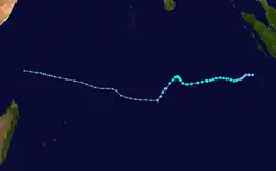 By the 19th conditions were less favourable, and the JTWC indicated that convection was sheared to the west of the well-defined, yet weak, circulation centre. Up to this point, Darwin and JTWC were in agreement regarding the system's strength and its potential for development. However, JTWC issued their first Tropical Cyclone Formation Alert on 21 November, placing the system's center about 200 nm east-northeast of Timor. At 0600 UTC they upgraded the low to a weak tropical cyclone and issued their first warning. JTWC forecast slight strengthening which did not materialise. They issued their second and final warning at 1800 UTC.[3] In their final best track, JTWC held the estimated tropical cyclone-strength intensity through the next day.[4] Though the system was overland for some time, the damage it caused is unknown.