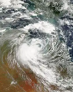 Mornington Island recorded more than 300 mm (12 in) of precipitation in a 24‑hour period and experienced gusts of 100 km/h (62 mph).[12] A few houses in the island lost power.[13] However, only light damages occurred, and there were no casualties on the island.[14] The town of Karumba also experienced heavy damage, with the storm surge damaging the beach.[15] The towns Burketown and Doomadgee in Queensland were isolated for two weeks due to flooded roads.[16]