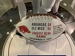 The 2001 Arkansas vs. Ole Miss football game was a college football game played on November 3, 2001, between the University of Arkansas Razorbacks and the University of Mississippi Rebels; it broke a then–NCAA record for the longest football game ever played. The game included seven overtime periods, one of five games to ever do so.[1] The lead went back and forth, with Ole Miss leading in the first quarter. The game was tied at halftime, and in the third quarter Arkansas gained a lead that Ole Miss would not get back until the fourth overtime.[2] The game ended in the seventh overtime period when Ole Miss quarterback Eli Manning failed to complete a pass on a two-point conversion play.[2]