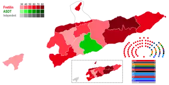Constituent Assembly elections were held in East Timor on 30 August 2001, the second anniversary of the independence referendum. One member was elected from each of the country's thirteen districts, whilst a further 75 were elected by proportional representation.[1] The result was a victory for Fretilin, which won 55 of the 88 seats. Voter turnout was 93%.[2] Following the election the Constituent Assembly nominated a transitional Council of Ministers with Mari Alkatiri as Chief Minister.[3]