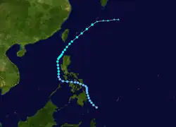 Utor spawned from an area of convection that developed off 907 km (565 mi) south-southeast of Guam on June 26, that remained quasi-stationary for 2 days before upgrading to a tropical depression on July 1 due to favorable conditions such as low vertical shear.[27] The depression strengthen into a tropical storm at 00:00 UTC on July 2.[13][27] Utor tracked west-northwest from a peripheral ridge and developed further, after entering the Philippine Area of Responsibility, and attained severe tropical storm status the following day. Utor was a large cyclone, with gale-force wind of 250 nmi (465 km; 290 mi).[11] Utor reached its peak strength on June 4, with 10-minute winds of 110 km/h (70 mph) and 1-minute winds of 150 km/h (95 mph), with the barometric pressure of 960 hPa (28 inHg).[13][11] Utor was centered 56 km (35 mi) near northern Luzon and tracked northwesterly as it began to weaken.[27] The storm made landfall near the east of Hong Kong on July 5 and quickly weakened before being last noted on July 7 by the JMA.[13]