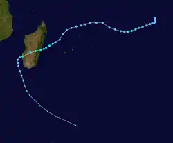 In late December, a tropical disturbance rapidly formed off the north-west coast of Madagascar. By late on December 30, MFR classified it as a tropical disturbance. The system quickly intensified while moving westward, becoming a strong tropical storm before hitting north-eastern Mozambique on December 31. Delfina weakened while moving inland, and it was no longer classifiable as a tropical cyclone by January 1.[7][18] However, its remnants moved across the country and into Malawi, later looping around and crossing back over Mozambique.[3] When the remnants reached the Mozambique Channel, they were reclassified as Tropical Disturbance 07, which moved southward over waters. It re-intensified into a tropical storm on January 8 before weakening the next day, becoming extratropical. The remnants persisted for several days, dissipating on January 14.[19][20]