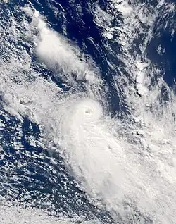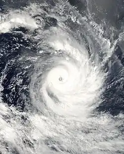 Around the same time that Tropical Storm Gerry was developing, another area of convection to its east was organizing.[31] On February 7, the system became a tropical disturbance, and initially moved to the north.[34] Operationally, MFR first began issuing advisories on February 9 for Tropical Disturbance 11, when the system had a small center and accompanying convection. By that time, the disturbance had turned to the south, and favorable conditions allowed for gradual development.[31] MFR upgraded the system to tropical storm status late on February 9,[34] although the system was not named Hape until 36 hours later. On February 10, the JTWC initiated advisories on Tropical Cyclone 17S. An eye developed on February 11, suggesting quick intensification.[31] At 1800 UTC that day, the JTWC and MFR upgraded Hape to the equivalent of a minimal hurricane and to tropical cyclone status, respectively.[34] By that time, the cyclone had turned to the east-north-east due to a weakness in a ridge to the north.[31] MFR estimated that Hape reached peak 10-minute winds of 150 km/h (93 mph) on February 12, and the next day the JTWC estimated 1-minute winds of 165 km/h (103 mph). Later, the storm weakened, and it turned to the south-east when the ridge re-intensified. Outflow decreased due to interaction with Cyclone Gerry to the west,[31] and Hape weakened to tropical storm status on February 13.[34] On February 15, the JTWC discontinued advisories once the circulation was exposed from the deep convection. The next day, MFR followed suit after the circulation dissipated.[31]