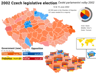 Parliamentary elections were held in the Czech Republic on 14 and 15 June 2002. The Czech Social Democratic Party (ČSSD) emerged as the leading party, winning 71 out of 200 seats in the Chamber of Deputies.[1] The Civic Democratic Party (ODS) followed with 56 seats.[2] Compared to the 74% voter turnout in 1998, participation dropped to 58% in 2002. The Communist Party achieved its strongest result since the Velvet Revolution, securing third place with 19% of the seats, while the Christian Democratic Union–Freedom Union alliance ranked fourth with 14%.[3]