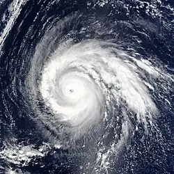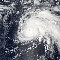 While accelerating northeastward, Hagibis developed a well-defined eye and underwent a period of rapid deepening.[26] On May 19, the JMA estimated peak 10-minute winds of 175 km/h (109 mph),[10] and the JTWC estimated 1-minute winds of 260 km/h (160 mph);[11] this made Hagibis become a second super typhoon after Mitag. At the time of its peak, the typhoon was located about 305 km (190 mi) west-southwest of the Northern Mariana Islands.[26] Hagibis only maintained its peak for about 12 hours,[10] after which the eye began weakening.[26] The trough that caused the typhoon's acceleration also caused the storm to lose tropical characteristics, and dry air gradually became entrained in the circulation.[26] On May 21, Hagibis became extratropical to the east of Japan after having weakened below typhoon intensity. The remnants continued to the northeast and dissipated south of the Aleutian Islands on May 22.[10]