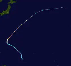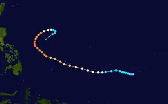 After affecting Yap, Mitag turned to the northwest and later to the north due to an approaching trough.[11] It passed to the north of Palau, contributing to one death there. Despite predictions of weakening,[21] the typhoon continued to intensify, reaching peak 10-minute winds of 175 km/h (109 mph) on March 5.[10] The JTWC estimated peak 1-minute winds of 260 km/h (160 mph) when the storm was about 610 km (380 mi) east of Catanduanes in the Philippines; this made Mitag became a super typhoon, the first one on record in the month of March. The combination of cooler air and interaction with the westerlies caused Mitag to weaken significantly. Only four days after reaching peak winds, the storm had dissipated well to the east of the Philippines.[21]