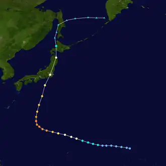 While passing the south of Taiwan, it dropped heavy rainfall peaking at 320 mm (13 in) in Pingtung County.[29] Rainfall in Japan peaked at 123 mm (4.8 in) at a station in Kagoshima Prefecture.[30] The threat of the storm prompted school closures and 20 airline flight cancellations.[31] Noguri injured one person, damaged one house, and caused about $4 million (¥504 million JPY) in agricultural damage.[nb 7][32]