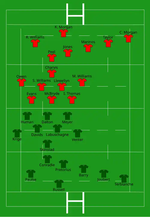In the first test, Wales led after the first 20 minutes, but tries from Marius Joubert and Bobby Skinstad gave the first advantage (15-11) for the victorious Springboks.[26]