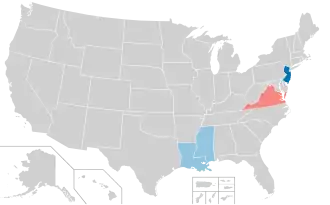 Partisan change only occurred in one chamber, as Democrats won control of the New Jersey Senate, which was previously tied.[2] However, Democrats did maintain control of the Mississippi Legislature, the Louisiana Legislature, and the New Jersey General Assembly. Republicans maintained control of the Virginia legislature, bringing a post-Civil War low for the Democratic Party.[3]