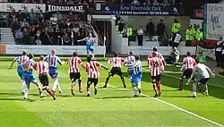 Brentford began the season as one of the top teams in League One, with five wins from the opening eight league matches putting the club at the top of the table.[6] A 3–2 defeat to Huddersfield Town on 17 September led to a dip in form and a run of two wins in 9 matches in all competitions dropped the Bees dropped to 4th place.[6][7] After first round exits of the League Cup and Football League Trophy, victory in the FA Cup first round over Rochdale on 5 November began a resurgence in form, with Brentford losing just twice in 20 matches and returning to the top of the table for the first time in over three months after victory over previous leaders Swansea City at Griffin Park on Boxing Day.[6]
