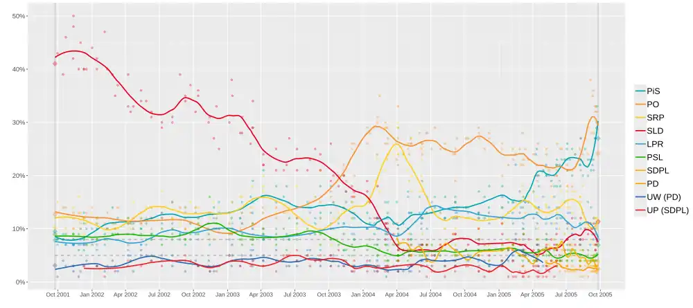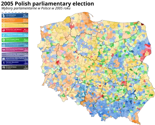 Parliamentary elections were held in Poland on 25 September 2005. All 460 members of the Sejm and 100 senators of the Senate were elected. The election resulted in a sweeping victory for two opposition parties: the right-wing, national-conservative Law and Justice (PiS) and the centre-right, liberal-conservative Civic Platform (PO). The incumbent centre-left government of the Democratic Left Alliance (SLD) was soundly defeated. PiS won 155 seats and PO 133, while the governing SLD was reduced to fourth place with 55 seats, behind Andrzej Lepper's Self-Defence party, which won 56 seats.