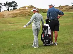 Annika Sörenstam with caddie Terry McNamara on the 10th hole during the Pro-Am | |