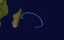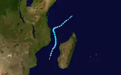 A non-tropical low originated in the southern Mozambique Channel on April 9, located off the east coast of Mozambique. The low absorbed the circulation of former Cyclone Jaya, intensifying gradually while moving to the southeast and later south. The MFR classified the system as a tropical depression on April 10, and that day the system passed west of Europa Island. The agency reclassified the system as a subtropical depression with gale-force winds on April 11, estimating peak winds of 95 km/h (60 mph). It was a small cyclone, with gale-force winds extending only 95 km (65 mi) from the center. The storm accelerated to the southeast, and transitioned into an extratropical cyclone on April 12, which the MFR tracked for another day.[3][54]