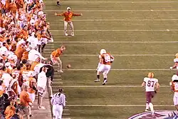Texas dominated the first quarter and set two Holiday Bowl records. The Longhorns' first score, on a two-yard touchdown pass from quarterback Colt McCoy to Derek Lokey, was the quickest in game history at 13:39 remaining in the quarter.[23] Lokey is best known as the Longhorns starting nose tackle but he is also used as an offensive end in short-yardage situations.[22] He had lined up at full-back for the play.[24] At the Holiday Bowl luncheon the day before, Lokey had joked that there was not a play in the Longhorn playbook that would result in him being deliberately given the ball.[22] The Longhorns scored 21 first quarter points – two more than SMU scored against BYU in 1980 in the old Holiday Bowl record.[2][23]