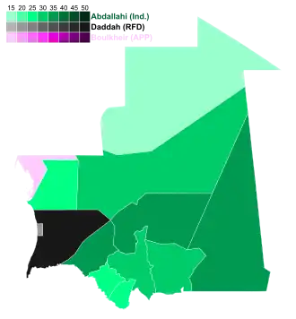 Following the election, on March 26, Interior Minister Mohamed Ahmed Ould Mohamed Lemine declared Abdallahi the winner, saying that he won 52.85% of the vote.[45] Abdallahi won 10 out of the country's 13 regions; Daddah won in Nouakchott, Inchiri Region, and Trarza Region.[46] Turnout was about 67.5%.[45] Daddah accepted the results and congratulated Abdallahi on his victory.[3] The results were confirmed on 29 March 2007.[47]