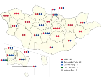 Members of the State Great Khural were elected from multi-seat constituencies in a plurality-at-large system, with two to four seats per aimag or (in Ulaanbaatar) düüreg.[2] Previous elections had single-seat constituencies, and the new, more complicated voting system was reported to have led to a delay in vote counting.[3]
