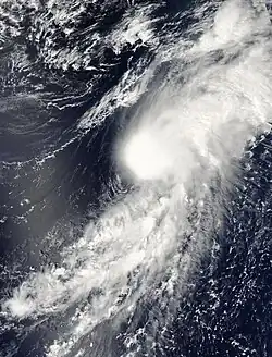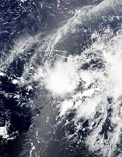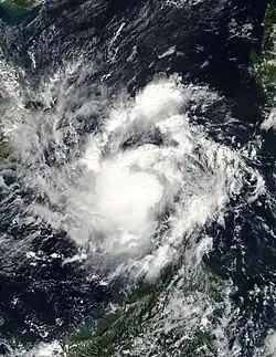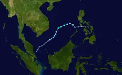 Early on January 11, the JTWC reported that an area of convection had persisted about 1,010 km (630 mi) to the southeast of Manila in the Philippines.[10] The disturbance was located near to a developing low level circulation center which was weak and remained displaced from the deep convection whilst located in an area of low to moderate vertical windshear.[10] During the next 24 hours the disturbance developed further with a Tropical Cyclone Formation Alert being issued the next day by the JTWC as the disturbance now had a well defined low level circulation center with convective banding on the northwestern edge.[11] Early on January 13, both the JMA and the JTWC reported that the first depression of the season had developed about 360 km (220 mi) to the west of Manila.[12][13] Later that day the JMA reported that the depression had reached its 10-minute peak windspeeds of 55 km/h (34 mph).[14] However early on January 14 the JTWC reported that the depression had continued to intensify and upgraded the depression to a Tropical storm and then six hours later reported 1-minute peak windspeeds of 65 km/h (40 mph).[13] Later that day it was downgraded to a Tropical depression due to weakening deep convection and a partially exposed low level circulation center.[13][15] Over the next few days the depression moved towards the east until early on January 18 when both the JMA and the JTWC reported that it had dissipated off the Malaysian coastline.[13][16] There were no reports of any damages or casualties associated with the depression.[17]