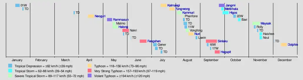 Typhoon Dolphin (2008)Tropical Storm Maysak (2008)Tropical Storm Higos (2008)Tropical Storm Mekkhala (2008)Typhoon Jangmi (2008)Typhoon Hagupit (2008)Typhoon Sinlaku (2008)Typhoon Nuri (2008)Tropical Storm Kammuri (2008)Typhoon Fung-wong (2008)Typhoon Kalmaegi (2008)Typhoon FengshenTropical Storm Halong (2008)Typhoon Rammasun (2008)Typhoon Neoguri (2008)