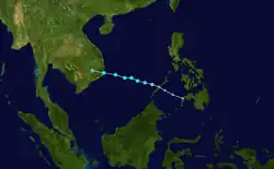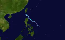 Early on May 14 PAGASA upgraded a tropical disturbance west of the Philippines to Tropical Depression Cosme.[57] Later that day the JTWC issued a TCFA,[58] later the first advisory on the system as Tropical Depression 05W.[59] On May 16, the JMA upgraded 05W to Halong.[60] Later that day, it was upgraded to a Severe Tropical Storm by JMA,[60] and a Typhoon by JTWC,[61] and reached its peak of 60 knots (110 km/h) early May 17.[60] It made landfall on western Pangasinan early May 17,[62] and weakened while crossing northern Luzon,[63][64] but after reaching open waters it re-organized while accelerating northeastward. The system intensified to a severe tropical storm again,[60] but never reached its previous peak intensity and began weakening as it moved northeast.[63] The JTWC and the JMA issued their final advisories on May 20.[65][66]