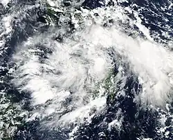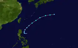 On May 13, a tropical disturbance formed about 550 km (340 mi), to the east of Manila in the Philippines.[42] The disturbance was located in an area of low vertical wind shear and had a consolidating low-level circulation center.[42] The JTWC then issued a Tropical Cyclone Formation Alert on the disturbance early the next day, as deep convection was building near to the low-pressure area.[43] Later that day both the JTWC and the JMA upgraded the disturbance to a tropical depression, citing good outflow.[44][45][46] Early on May 15, as the storm was moving towards the northwest, the JMA upgraded the depression to a tropical storm.[47] The Philippine Atmospheric, Geophysical and Astronomical Services Administration (PAGASA) then designated the storm as Tropical Depression Dindo.[48] While the storm accelerated to the northwest in response to a mid-latitude trough,[49] the JTWC upped into a tropical storm and had reached its peak intensity with winds of 75 km/h (45 mph).[50] Early on May 16, both PAGASA and the JTWC issued their final advisories on the storm as it approached the edge of PAGASA's Area of responsibility, with the JTWC reporting that Matmo was now extratropical.[51][52] However, data from the JMa suggested that it obtained peak wind speeds of 95 km/h (60 mph) at this time, which made Matmo a severe tropical storm.[47] Though, within their next advisory, the JMA downgraded Matmo to a tropical storm before dissipating the net day.[47][53]