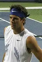 Jo-Wilfried Tsonga, ranked 38 on January 1, defeated Murray, Gasquet and Nadal en route to his first final in the ATP Tour at the Australian Open (lost to Djokovic).[34] Sidelined during three months of the season due to a right knee injury, Tsonga missed both the French Open and Wimbledon,[35] coming back to competition at the US Open where he was defeated in the third round (lost to Robredo).[36] Tsonga won his first career title in a rematch of the Australian Open final in the International Series event of Bangkok (def. Djokovic), and earned his Tennis Masters Cup qualification with his second career title (his first Masters Series shield) at the Paris Masters (def. Nalbandian).