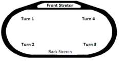 Texas Motor Speedway is one of ten intermediate to hold NASCAR races; the others are Atlanta Motor Speedway, Kansas Speedway, Chicagoland Speedway, Darlington Raceway, Homestead Miami Speedway, New Hampshire Motor Speedway, Kentucky Speedway, Las Vegas Motor Speedway, and Charlotte Motor Speedway.[4] The standard track at Texas Motor Speedway is a four-turn quad-oval track that is 1.5 miles (2.4 km) long.[5] The track's turns are banked at twenty-four degrees, while the front stretch, the location of the finish line, is five degrees. The back stretch, opposite of the front, also has a five degree banking.[5] The racetrack has seats for 191,122 spectators.[5]