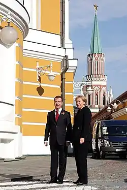 Chinese leader Hu Jintao confirmed his attendance at the parade on 3 May. The following day Slovak President Ivan Gašparovič's attendance was confirmed.[7] Other world leaders who confirmed their attendance included Czech President Václav Klaus,[8] French President Nicolas Sarkozy,[8] Italian Prime Minister Silvio Berlusconi,[8] Serbian President Boris Tadić,[9] Bulgarian President Georgi Parvanov,[10] and Vietnamese President Nguyễn Minh Triết,[11] Leaders from Armenia, Azerbaijan, Estonia, Greece, Israel, Kazakhstan, Latvia, Mongolia and Slovenia also confirmed their attendance.[9] On 8 May, Sarkozy and Berlusconi announced that they wouldn't be attending the parade in Moscow, so that they could deal with the euro area crisis.[12][13]