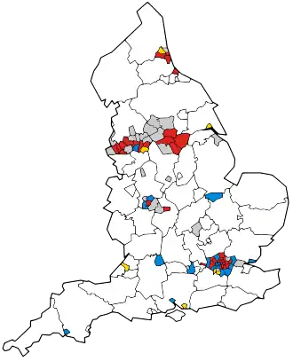 All 32 London boroughs, all 36 metropolitan boroughs, 20 out of 55 unitary authorities, 76 out of 212 district councils, and 4 directly elected mayors | |||||||||||||||||||||||||||||||||||||||||||||
