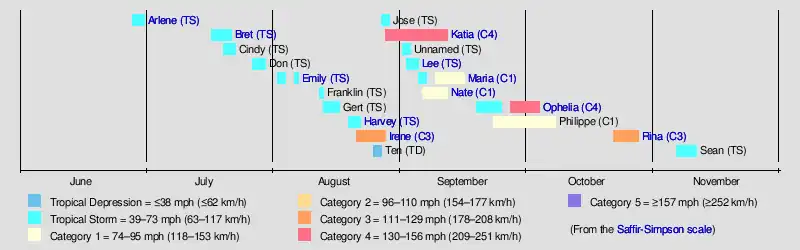 Tropical cyclogenesis began in the month of June, with Tropical Storm Arlene forming on June 28. After Arlene dissipated on July 1, there was about a two-week lull in activity, before Bret, Cindy, and Don developed in the latter half of July. August was the most active month of the season, featuring eight tropical cyclones – Emily, Franklin, Gert, Harvey, Irene, Tropical Depression Ten, Jose, and Katia. The number of named storms in August was well above the 1944–2010 average of four,[27] and just one short of the record of eight set in 2004 and later in 2012,[28] but the number of hurricanes was below the mean.[27] September was slightly above average,[29] with 5 named storms, 2 hurricanes, and 1 major hurricane and featuring the unnamed tropical storm, Lee, Maria, Nate, Ophelia, and Philippe. Ophelia was the most intense tropical cyclone of the season, peaking as a Category 4 hurricane with winds of 140 mph (225 km/h) and a minimum pressure of 940 mbar (28 inHg). The next two months featured one system each, with Rina developing in October and Sean forming in November. Sean was the final storm of the season and became extratropical on November 11.[30]