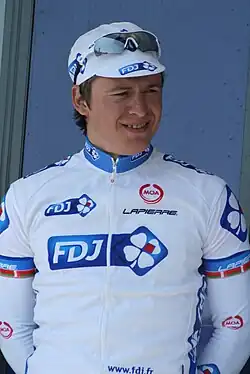 Pinot continued his good form in August's Tour de l'Ain, winning two stages including the final stage summit finish to Le Grand Colombier,[88] and also held the overall lead after his stage 2 victory.[89] At the Tour du Limousin, after a seventh place and a second place in the opening two stages, Ladagnous won stage three by out-sprinting Cofidis rider Samuel Dumoulin to the line, enabling him to move into third place in the general classification.[90] Ladagnous repeated his victory the next day, to take second place overall, behind Vacansoleil–DCM's Björn Leukemans.[91] The squad took two minor classification victories at the race, with Roux winning the sprints classification and Geslin winning the mountains classification.[91] Later in August, at the Tour du Poitou-Charentes, the squad took their fifth stage victory of the month as Hutarovich earned another victory in a sprint finish, by taking the spoils in the second stage,[92] and later took the overall lead after a second-place finish in the following morning's third stage.[93] Hutarovich lost almost four minutes in the afternoon time trial, but a fifth-place finish in the final stage secured Hutarovich in the points classification.[94] Pinot scored his fourth stage win of the year by soloing to victory in the opening stage of the Settimana Ciclistica Lombarda.[95] Pinot maintained his overall lead to the end of the race, and also won the young rider classification, as he did in the Alsace.[96]