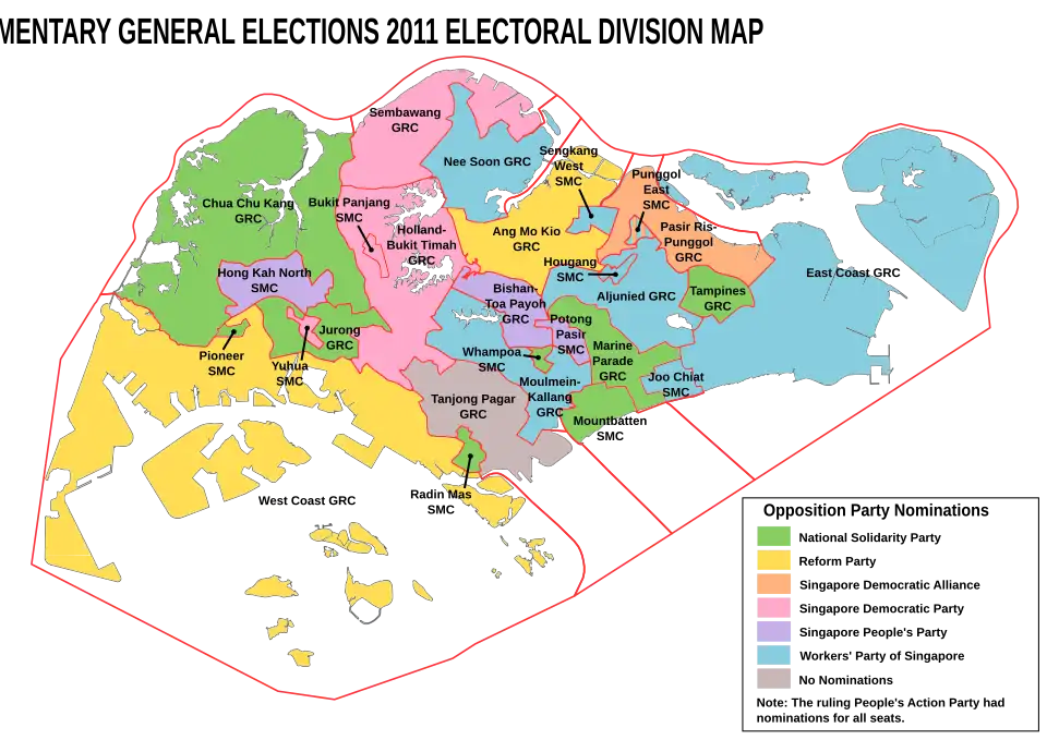 - ^ "81 out of 87 seats for PAP". Straits Times. 8 May 2011. Archived from the original on 9 May 2011. Retrieved 8 May 2011.