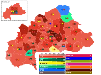 Just under 76% of eligible voters participated in the elections, the highest turnout since multi-party politics was reintroduced in 2002, possibly due to the perceived viability of opposition to the CDP.[2] Support in some electoral districts shifted from the CDP to the UPC, leading to a notable decrease in the CDP's popular vote count, although it only lost three seats.[2] The UPC secured as many votes as the ADF–RDA, and more votes than any other opposition party. Overall, thirteen parties won seats.