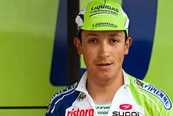 FDJ–BigMat's Anthony Roux was the rider in question,[36] and he set off after the quartet up front, and was able to reach them with around 7 km (4.3 mi) remaining of the stage. However, the peloton was not far behind, and the breakaway did not last much longer after that. With the field back together, several riders attempted solo moves off the front of the peloton, including Kadri's team-mate Mikaël Cherel,[35] but all were unsuccessful. The group remained together into the climb towards the finish; Liquigas–Cannondale and BMC Racing Team headed the group, protecting their main riders Nibali and Cadel Evans from any potential trouble. World time trial champion Tony Martin tried to get clear within the final kilometre for Omega Pharma–Quick-Step but could not sustain a gap over everyone else, and Team Katusha rider Daniel Moreno timed his sprint perfectly,[37] to take his third win of the season, ahead of French pair Julien Simon (Saur–Sojasun) and RadioShack–Nissan's Tony Gallopin.[38] Wiggins finished ninth to maintain his one-second overall lead over Evans, who was seventh.[34][39]