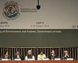 The 2012 Hyderabad Conference of the Parties to the UN Convention on Biological Diversity (CBD), also known as COP11, was held in Hyderabad, India. Environment ministers and forests ministers of about 194 countries attended the conference; international organizations like World Bank and the Asian Development Bank also participated. Nearly 10,000 delegates discussed issues relating to biodiversity and biosafety.[1]