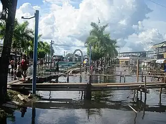 Wet weather in Loreto brought downpours and much drizzle, causing damage and flooding to the Loreto Region since November 2011. The rainy weather continued into early 2012, and the water level rose in the Amazon —extensive stream that feeds most of the Loreto tributaries— to 117 m.[3] From February and March, several towns were affected (19,209–18,400 affected families), 26 000 hectares of farmland were flooded and water level reached the coastal streets of Iquitos. Other sites concerned were in the Ucayali Region. At the end of April, the water levels began to decrease.[4]