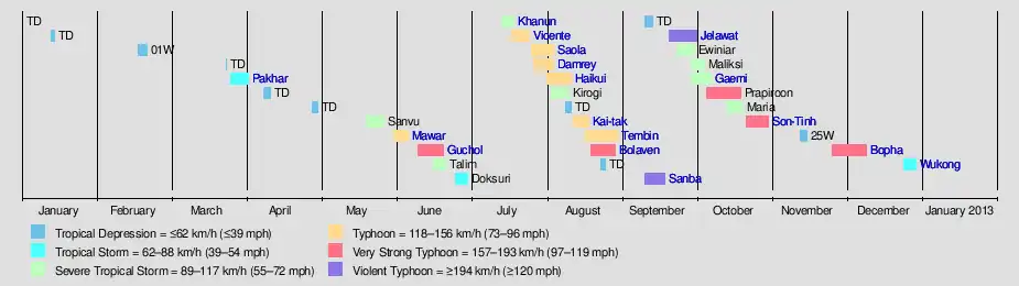 Tropical Storm Wukong (2012)Typhoon BophaTyphoon Son-TinhTropical Storm Gaemi (2012)Typhoon Jelawat (2012)Typhoon SanbaTyphoon Bolaven (2012)Typhoon Tembin (2012)Typhoon Kai-tak (2012)Typhoon HaikuiTyphoon Damrey (2012)Typhoon Saola (2012)Typhoon VicenteTropical Storm Khanun (2012)Typhoon Guchol (2012)Typhoon Mawar (2012)Tropical Storm Pakhar (2012)