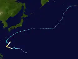 With warm sea surface temperatures and decreasing wind shear, Mawar developed a central dense overcast.[73] This led to the JMA upgrading Mawar to a severe tropical storm on June 2.[74] The JTWC subsequently upgraded it to a Category 1 typhoon as a developing eye feature was seen on microwave imagery.[75] Turning northeastward as a mid-latitude trough weakened the subtropical ridge to the northeast, Mawar further intensified into a Category 2 typhoon early on the next day, as a ragged eye became visible on satellite imagery.[76] The JMA followed suit and upgraded Mawar to a typhoon later that same day.[77] By June 4, Mawar reached its peak intensity,[78][79] before it started to weaken due to the mid-latitudes impacting the system's overall structure, with its eye breaking down into tight spiral banding, prompting the JTWC to downgrade the system to a category 2 typhoon.[80] On the next day, the PAGASA issued their final advisory on Mawar, as it was exiting the Philippine Area of Responsibility.[81] Mawar further weakened into a category 1 typhoon as its low-level circulation center widened, and was entering a hostile environment due to its interaction with the jet stream.[82] The JMA subsequently downgraded Mawar to a severe tropical storm,[83] as it commenced its extratropical transition.[84] Late on the same day, the JTWC issued their final advisory on Mawar, as it was deeply embedded in the baroclinic zone and its low-level circulation center had decoupled behind its convection.[85] On June 6, Mawar fully became an extratropical cyclone, and the JMA issued their final advisory on the system.[86] The system was last noted east of the Kamchatka Peninsula on June 13.[87]